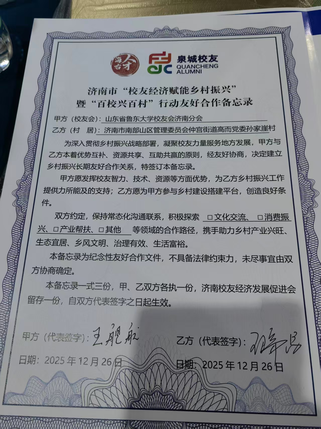2026年1月31日,鲁东大学济南校友会理事会赴孙家崖村,开展“百校兴百村”调研对接活动,并作为首批结对共建单位,与济南市南部山区仲宫街道孙家崖村签署合作协议,响应济南市“校友经济赋能乡村振兴”号召。